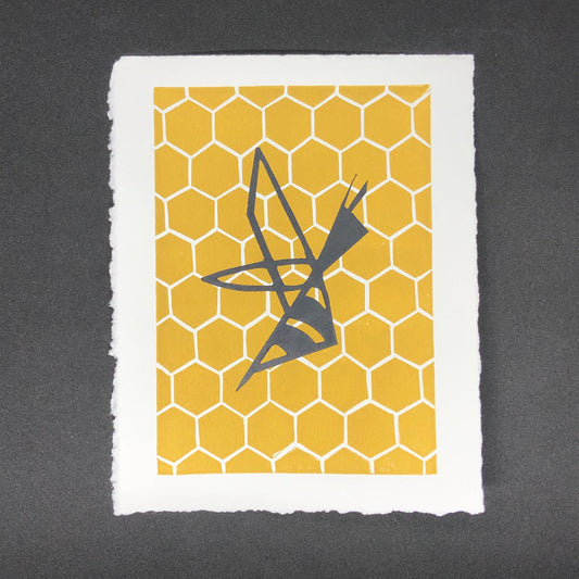 Bee’s Knees Original Linocut Print, 5 x 7 in. (12.7 x 17.8 cm), Stylized Honeybee and honeycomb, Original Wall Art, Gifts for Gardener